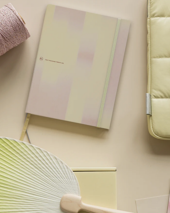 Con bonitos colores limón y beige y un tamaño cómodo para llevar en la mochila. La portada tiene un grabado dorado.