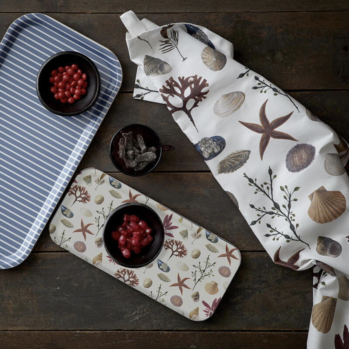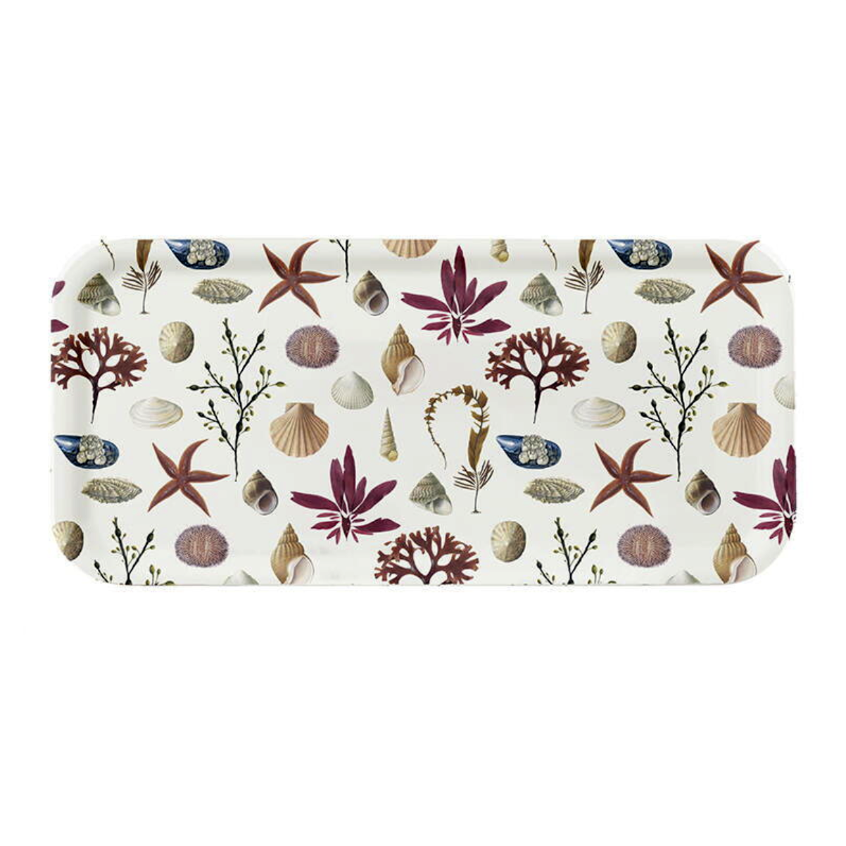 Este bandeja forma parte de la colección Beach y te servirá para muchos fines. El color de fondo de la bandeja es blanco, con unas ilustraciones de almejas, conchas, algas y pequeños animales del mar.