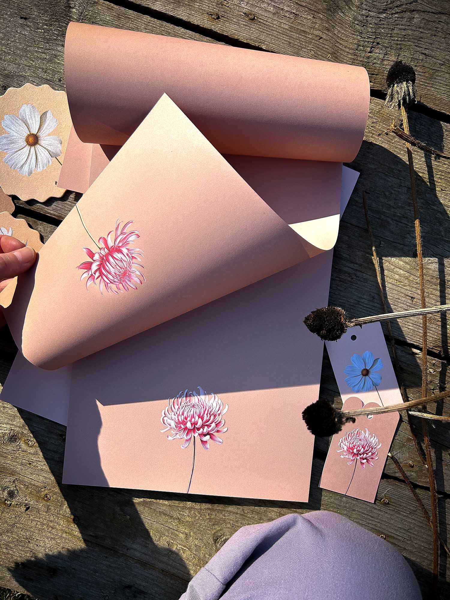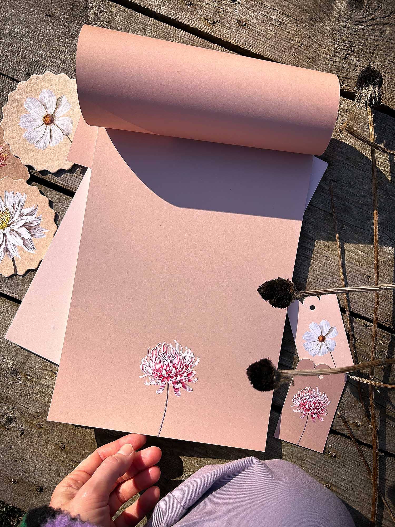 Bloc de notas práctico y bonito con una bonita ilustración de la flor Crisantemo. En un lado la verás abierta y en el otro cerrada.