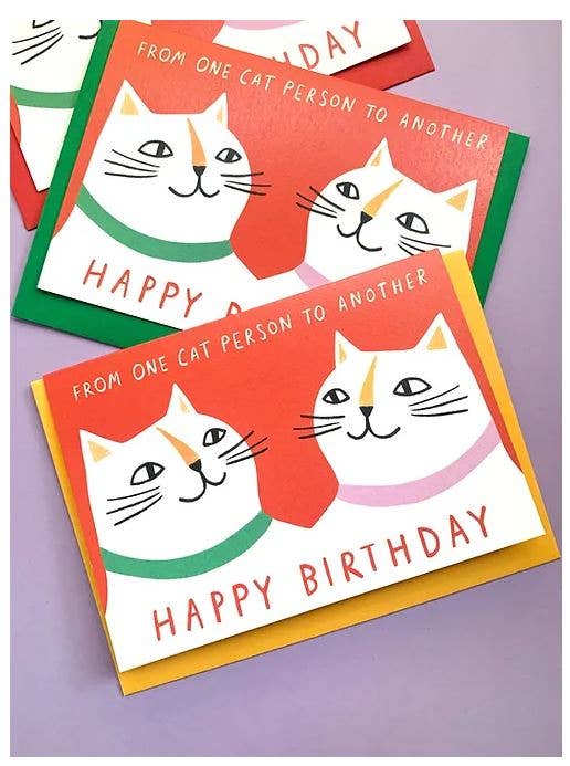 Esta tarjeta dice "Happy Birthday. From one cat person to another"