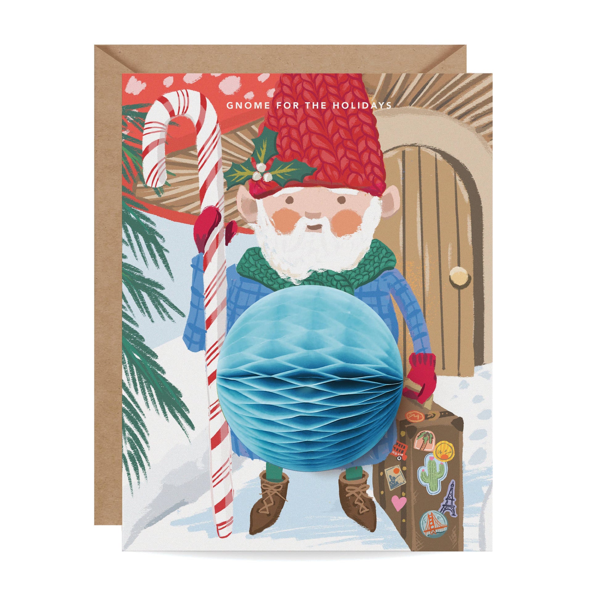El espíritu navideño te lo trae este divertido Gnomo, que te felicita las fiestas con el mensaje "Gnome for the holidays" (El gnomo de las Fiestas). El interior de la tarjeta es blanco para que puedas escribir lo que desees.